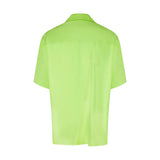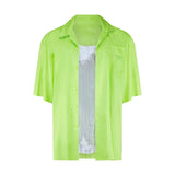 A shirt that can be worn two ways, with a silk lace trimmed camisole body and lime green button up shirt outer layer.